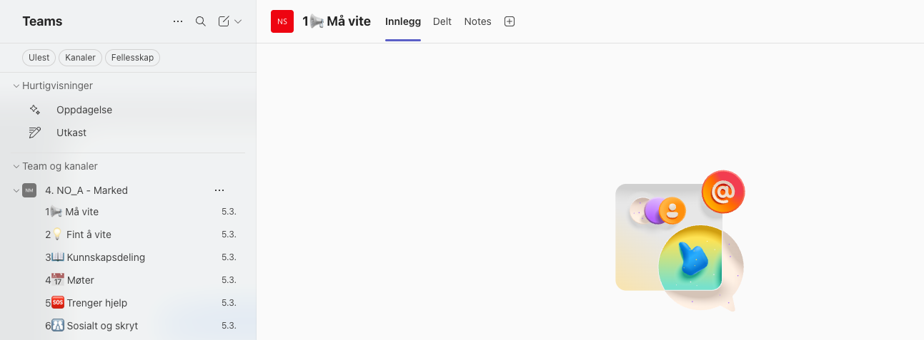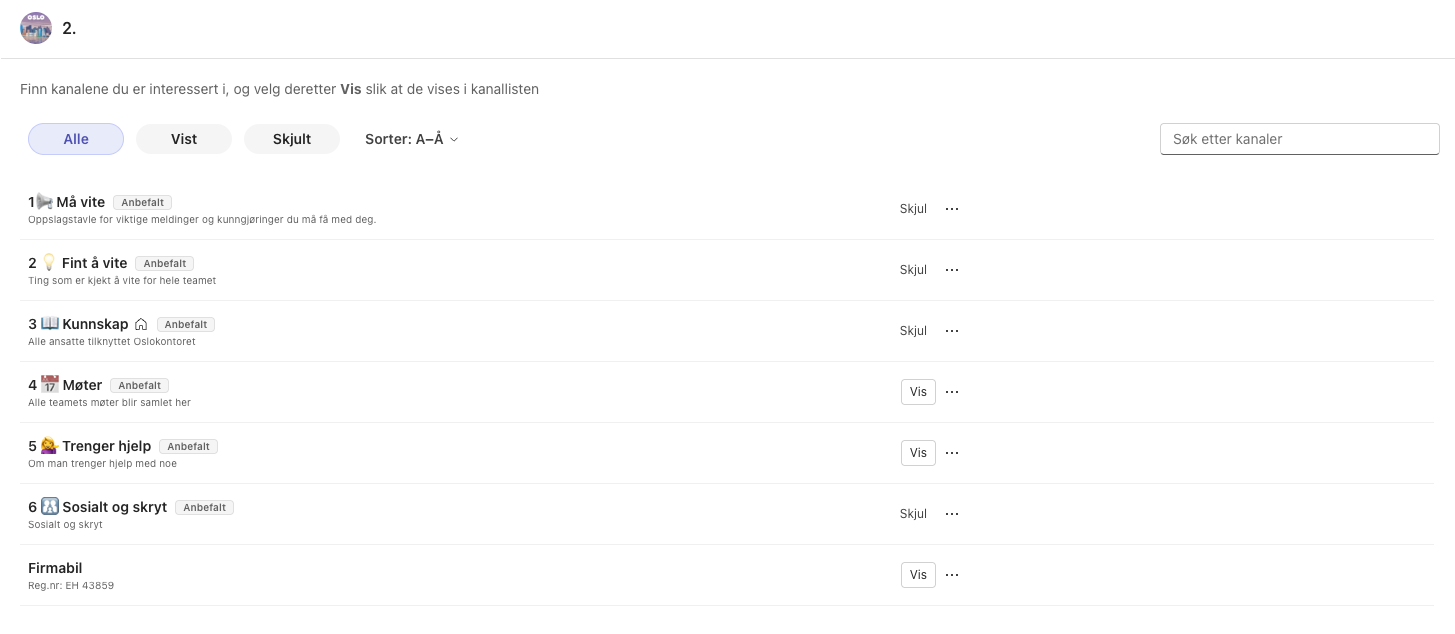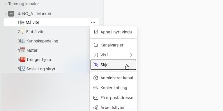 Ikke alle kanaler er relevante for alle. Derfor kan – og bør – du skjule kanaler du ikke trenger i det daglige. Samtidig er det viktig å beholde kanaler med informasjon som er viktig for rollen din. Riktig bruk av skjulte kanaler gir bedre fokus, uten at informasjonen forsvinner.