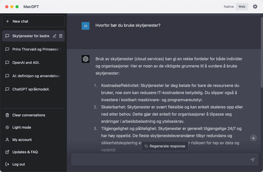 I eksempelet over spurte vi ChatGPT: «Hvorfor bør du bruke skytjenester?». ChatGPT genererte så et svar hvor den beskrev flere viktige grunner til at vi bør bruke skytjenester.