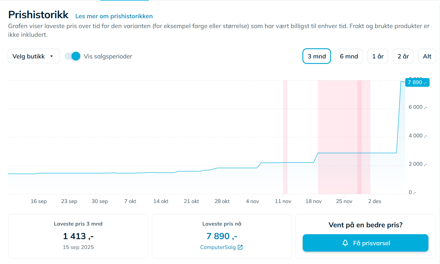 Skjermbilde: Prisstigningen til minnebrikker (RAM) på Prisjakt.no