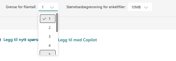 Du kan også definere antall filer respondenten kan laste opp, og maks størrelse på filene (10M, 100MB eller 1GB).