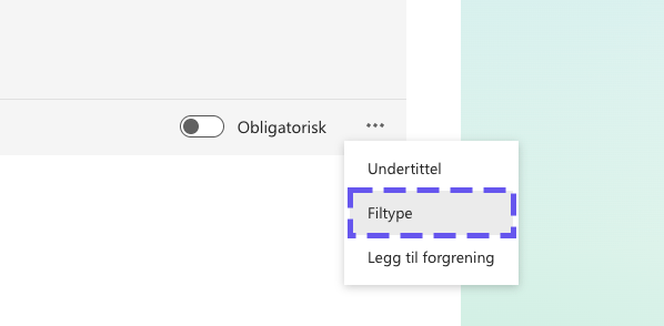 Du kan også styre hvilken filtype som respondenten kan laste opp med å trykke på de tre prikkene «•••» og «Filtype» nede til høyre i kolonnen: